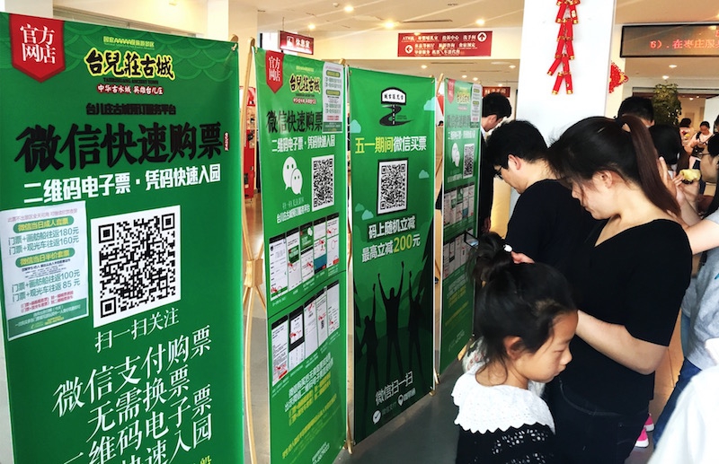 (圖為:游客正在臺兒莊通過微信掃碼購票)
